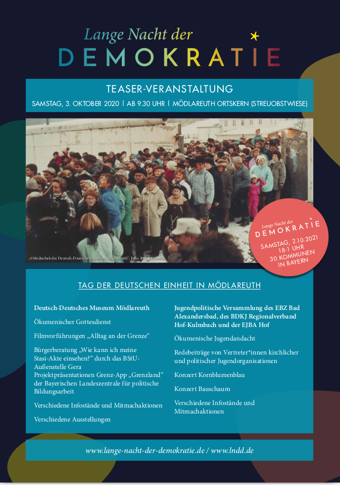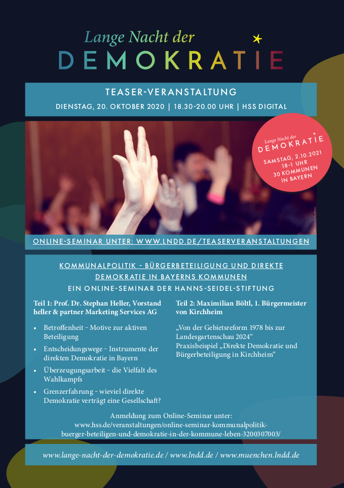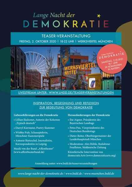 Gesellschaft zusammen – in der Kommune, in Bayern, in Deutschland und in Europa? Dieser Frage gingen wir bis zur eigentlichen „Langen Nacht der Demokratie“ am 2. Oktober 2021 in Teaserveranstaltungen nach.