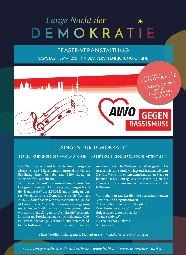 Das Ziel unseres Projekts ist die Gewinnung von Menschen mit Migrationshintergrund, sowie die Erhöhung ihrer Teilhabe und Mitwirkung an Aktionen für Demokratie. Wir haben die Anti-Rassismus-Woche zum Anlass genommen, den Aktionstag der „Langen Nacht der Demokratie“ am 2.10.2021 anzukündigen. Unser Verständnis von Demokratie ist die Teilhabe ALLER, daher haben wir uns insbesondere um das Mitwirken von Migrantenorganisationen gekümmert. Um der Vielfalt eine Stimme zu geben, haben wir das Projekt „Singen für Demokratie“ genannt.