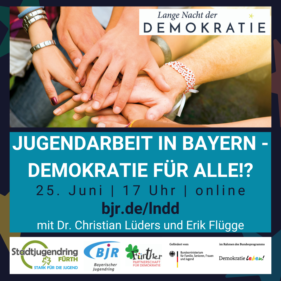 Der Bayerische Jugendring und der Stadtjugendring Fürth luden zu der Fachveranstaltung ein. Sie ist nicht zuletzt auch als Anregung für die Lange Nacht der Demokratie gedacht, die auch in Fürth am 2. Oktober 2021 stattfinden wird. Bayernweite Teaserveranstaltungen zeigen bis September die Vielfalt unserer Demokratie und wie unterschiedliche Themenfelder unser Demokratie-Verständnis prägen. Die Veranstaltung wird durch die Fürther Partnerschaft für Demokratie im Rahmen des Bundesprogramms „Demokratie leben“ gefördert.