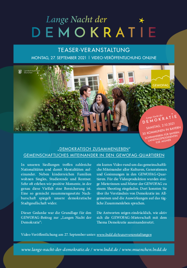 Eine so gemischt zusammengesetzte Nachbarschaft spiegelt unsere demokratische Stadtgesellschaft wider. Dieser Gedanke war die Grundlage für den GEWOFAG-Beitrag zur „Langen Nacht der Demokratie“: ein kurzes Video rund um das gemeinschaftliche Miteinander aller Kulturen, Generationen und Gesinnungen in den GEWOFAG-Quartieren.